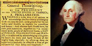 • “Now, therefore, I do recommend and assign Thursday, the 26th day of November, next, to be devoted by the people of these States to the service of that great and glorious Being who is the beneficent author of all the good that was, that is, or that will be; that we may then unite in rendering unto Him our sincere and humble thanks for His [many blessings before becoming a nation, during the late war, etc.]….