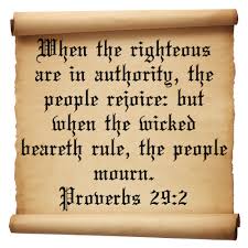 Pr.29.2“When the righteous are in authority, the people rejoice: but when the wicked beareth rule, the people mourn” (Pr. 29.2). “Evil men understand not judgment: but they that seek the LORD understand all things” (Pr. 28.5). “The wicked shall be turned into hell, and all the nations that forget God” (Ps. 9.17).