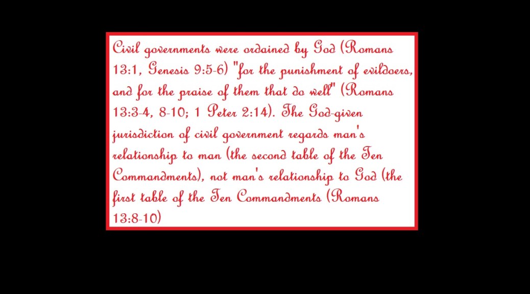 What are the powers which are ordained by God? They are individual, family, civil, and church governments. Each lower power is subject to higher powers. Power means the possession or control or command over oneself, another or others. “Powers” as spoken of in Romans 13.1-2 means “governments” since government means direction, control or rule. This is obvious from the immediate and overall context of Scripture. Each power or government has a God-given goal (the glory of God) and jurisdiction. Civil government and God have jurisdictions (Matthew 22.21, Mark 12.17, Luke 20.25).  God gave each of the lower powers free will or choice of whether to honor the higher powers.