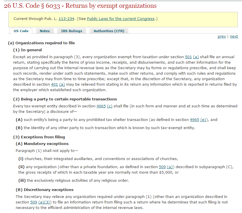 “Except as provided in paragraph (3), every organization exempt from taxation under section 501(a)shall file an annual return, stating specifically the items of gross income, receipts, and disbursements, and such other information for the purpose of carrying out the internal revenue laws as the Secretary may by forms or regulations prescribe, and shall keep such records, render under oath such statements, make such other returns, and comply with such rules and regulations as the Secretary may from time to time prescribe; except that, in the discretion of the Secretary, any organization described in section 401(a)may be relieved from stating in its return any information which is reported in returns filed by the employer which established such organization.” – Source, Cornell Law University