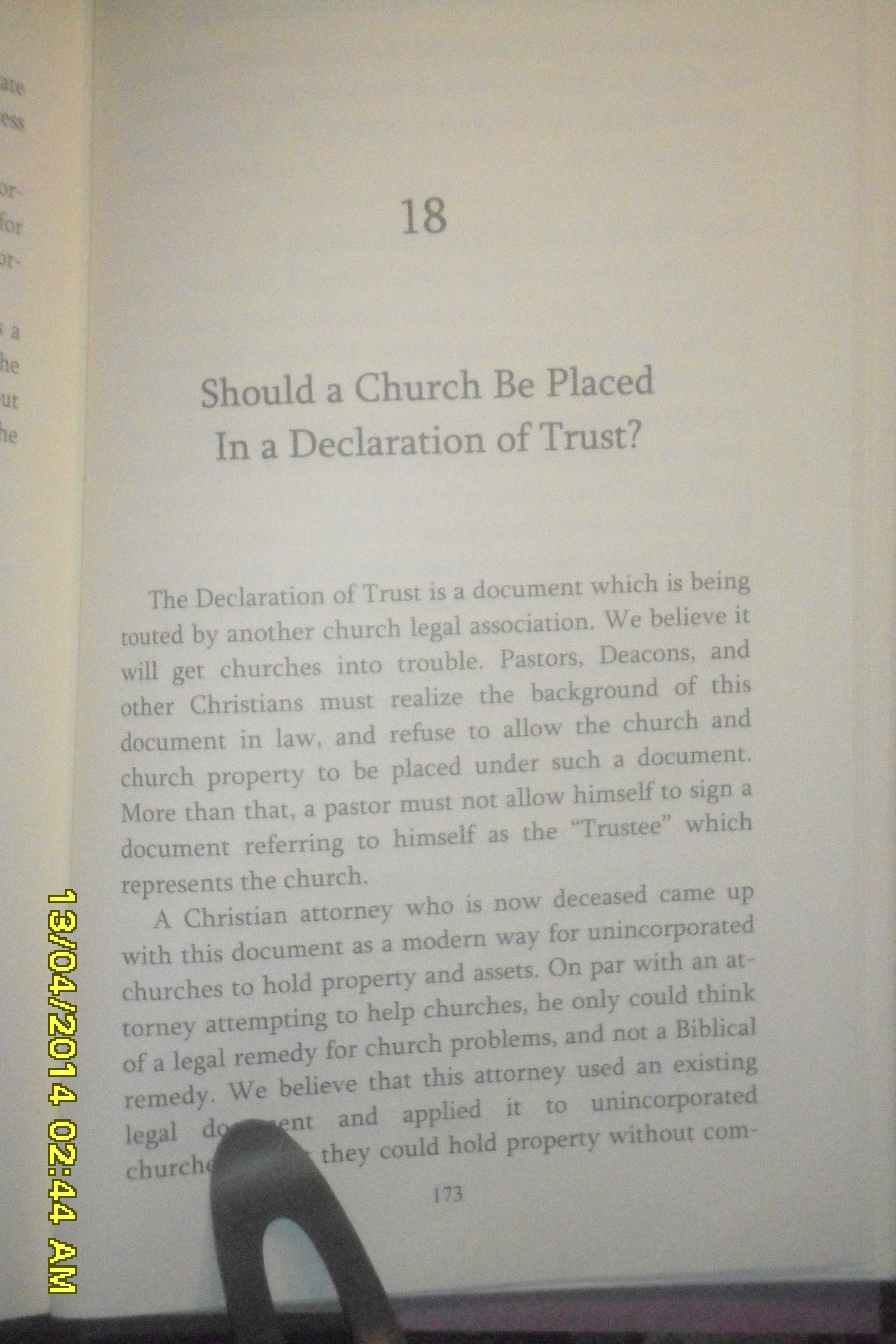 Note. Much of this chapter explains aspects of the ordinary trust and Declaration of Trust utilized by this ministry in helping churches who want to please God in their organization. When I wrote this chapter and this booklet, I had not published Simply Church: The Holy Union of Christ and His Local Church which concisely explains the “ordinary” trust, which is a relationship with property only, not an entity of any kind, and the importance of a written Declaration of Trust.