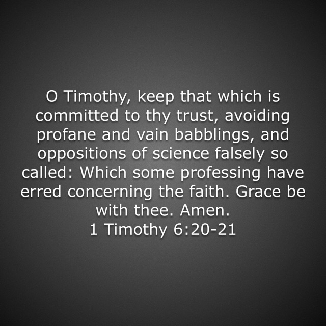 “O Timothy, keep that which is committed to thy trust, avoiding profane and vain babblings, and oppositions of science falsely so called:” 1 Ti. 6:20
