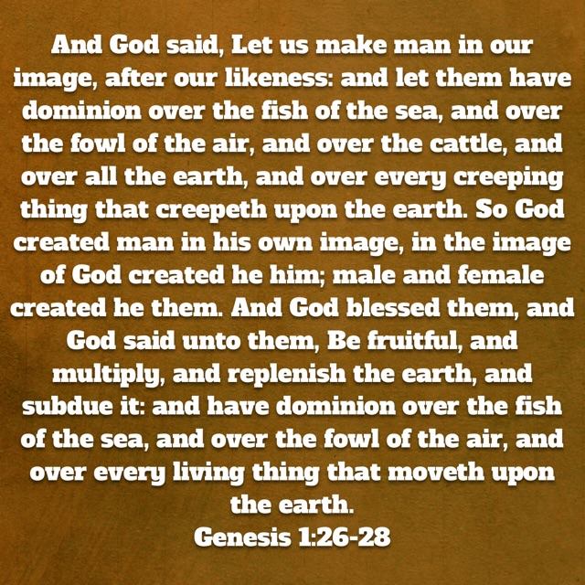 “And God blessed them, and God said unto them, Be fruitful, and multiply, and replenish the earth, and subdue it: and have dominion over the fish of the sea, and over the fowl of the air, and over every living thing that moveth upon the earth. And God said, Behold, I have given you every herb bearing seed, which is upon the face of all the earth, and every tree, in the which is the fruit of a tree yielding seed; to you it shall be for meat. And to every beast of the earth, and to every fowl of the air, and to every thing that creepeth upon the earth, wherein there is life, I have given every green herb for meat: and it was so. And God saw every thing that he had made, and, behold, it was very good. And the evening and the morning were the sixth day.” (Ge. 1.28-31).