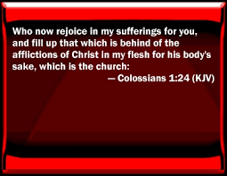 Colossians 1:24 “Who now rejoice in my sufferings for you, and fill up that which is behind of the afflictions of Christ in my flesh for his body’s sake, which is the church:” Paul, in following Christ, suffered for “the body’s sake, which is the church.” Of course, on earth, the institution of the church is manifested in the local New Testament church. “Colossians” was written to and for the church at Colosee, with principles that God desires to be applied to every New Testament church body. Just read the epistles of Paul to get an idea of his suffering and contention for and within the local church. Of course, the church at Philippi was an exception. It was a church which had only insignificant problem(s)—no false doctrine as the churches of Galatia; no problems with Christian conduct as with the church at Corinth.