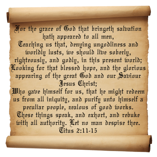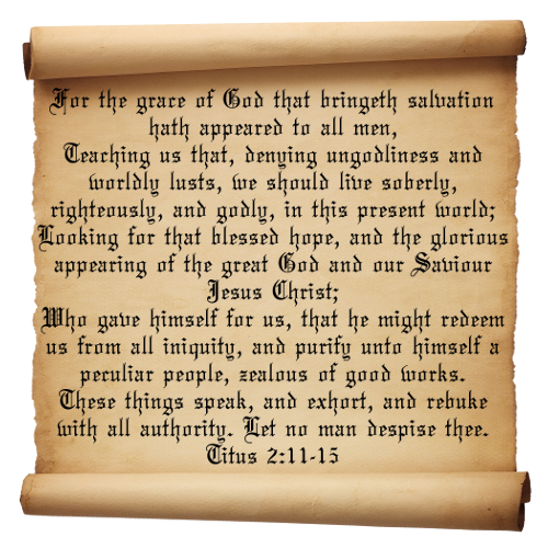 Paul interrupts these admonitions to put a doctrinal foundation under the lives of these people. He puts it in past, present and future. I believe that the grace of God speaks to all men (v11) about these matters. The grace of God teaches every person that he/she should deny ungodliness and worldly lusts and live soberly, righteously, and godly in this present world (v12). God’s grace puts the believer on a solid foundation. The gospel is good news, it is the power of God unto salvation.