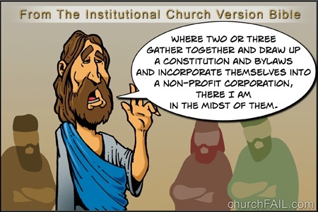Spiritual matters include all things involving a church, including the use of property for the assembly of the saints. God grieves when a church corrupts the body of Christ by putting herself under civil government in order to own anything. A church who chooses to become an earthly entity by incorporating (aggregate or sole) or getting 501(c)(3) or 508 status has betrayed her first love, corrupted the body, profaned the holy, joined with a harlot, and committed spiritual fornication. President James Madison understood this. See Endnote 1 for his letter vetoing a bill which would have incorporated a church in Washington D.C. which was subject to federal law and the First Amendment. See also, Legal Explanation of Incorporation of Churches. Church corporate status puts a church partially under the authority of the state under which the church incorporated. Internal Revenue Code Section 501(c)(3) or 502 status puts a church partially under the authority of the federal government. See Federal government control of churches through IRS Code Sections 501(c)(3) and 508 tax exemption and The incorporation-501(c)(3) control scheme.