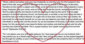 v18 This is for the purpose of order in the home, not for the purpose of a browbeating husband. A wife should not stay with a drunken husband and maybe beats her. She loses her own personality she loses her own dignity, and she will find herself being brought down to his level is she submits to that. She is to submit “as it is fit in the Lord.”