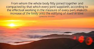 2. “But speaking the truth in love, may grow up into him in all things, which is the head, even Christ:  From whom the whole body fitly joined together and compacted by that which every joint supplieth, according to the effectual working in the measure of every part, maketh increase of the body unto the edifying of itself in love” (Ep. 4.15-16).