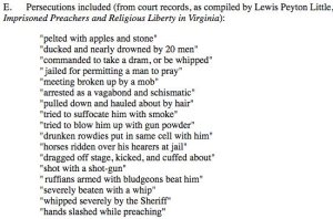 [2] Charles F. James, Documentary History of the Struggle for Religious Liberty in Virginia (Harrisonburg, VA.: Sprinkle Publications, 2007; First Published Lynchburg, VA.: J. P. Bell Company, 1900), pp. 29-30. Included is a listing of some of those jailed and otherwise persecuted. See also James R. Beller, America in Crimson Red: The Baptist History of America (Arnold, Missouri: Prairie Fire Press, 2004), pp. 230-250; William L. Lumpkin, Baptist Foundations in the South (Eugene, Oregon: Wipf & Stock Publishers, 2006), pp. 105-120; William P. Grady, What Hath God Wrought:A Biblical Interpretation of American History (Knoxville, Tennessee: Grady Publications, Inc., 1999), Appendix A, pp. 593-598 citing Lewis Peyton Little, Imprisoned Preachers and Religious Liberty in Virginia, (Galatin, Tenn.: Church History Research and Archives, 1987), pp. 516-520 (lists many Baptists and the persecutions they endured in Virginia; persecutions such as being jailed for preaching, civil suit, being annoyed by men drinking and playing cards, being jerked off stage and head beaten against the ground, hands being slashed, beaten with bludgeons, being shot with a shotgun, ousted as a justice for preaching, being brutally beaten by a mob, severely beaten with a stick, etc.).