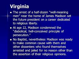 “At the time of Madison’s return from Princeton, several ‘well-meaning men,’ as he described them, were put in prison for their religious views. Baptists were being fined or imprisoned for holding unauthorized meetings. Dissenters were taxed for the support of the State Church. Preachers had to be licensed. Madison saw at first hand the repetition of the main evils of the Old Country. But he also saw a deep dissatisfaction among the people—the kind of dissatisfaction that would grow and that would serve as a mighty battering ram for religious freedom.” (Norman Cousins, In God We Trust (Kingsport, Tennessee: Kingsport Press, Inc., 1958), p. 296.)
