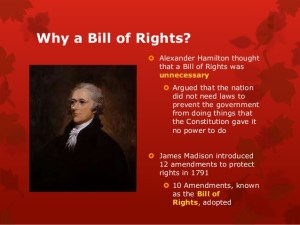 Others were against a bill of rights. “James Wilson argued that ‘all is reserved in a general government which is not given,’ and that since the power to legislate on religion or speech or press was not given to the Federal government, the government did not possess it, and there was therefore no need for an express prohibition.”[6] “Alexander Hamilton argued that a bill of rights, not only was unnecessary, but would be dangerous, since it might create the inference that a power to deal with the reserved subject was in fact conferred.”[7]