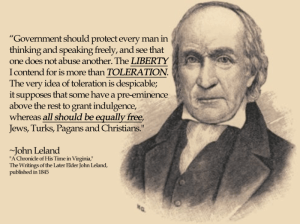 “On February 4, [Backus] spoke of ‘the great advantage of having religious tests and hereditary nobility excluded from our government.’ These two items in the Constitution seemed to him a guarantee against any establishment of religion and against the formation of any aristocracy. ‘Some serious minds discover a concern lest, if all religious tests should be excluded, the congress would hereafter establish Popery, or some other tyrannical way of worship. But it is most certain that no such way of worship can be established without any religious test.’ He said ‘Popery,’ but he probably feared, as many Baptists did, that some form of Calvinism of the Presbyterian or Consociational variety was more likely. His interpretation of this article helps to explain why the Baptists [of Massachusetts] made no effort to fight for an amendment on freedom of religion along with the others which the convention sent to Congress.”[4]