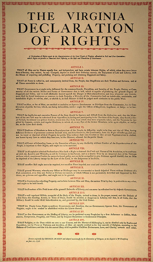 The Virginia Declaration of Rights is a document drafted in 1776 to proclaim the inherent rights of men, including the right to reform or abolish “inadequate” government. It influenced a number of later documents, including the United States Declaration of Independence (1776) and the United States Bill of Rights (1789). The Declaration was adopted unanimously by the Fifth Virginia Convention at Williamsburg, Virginia on June 12, 1776 as a separate document from the Constitution of Virginia which was later adopted on June 29, 1776. In 1830, the Declaration of Rights was incorporated within the Virginia State Constitution as Article I, but even before that Virginia’s Declaration of Rights stated that it was ‘”the basis and foundation of government” in Virginia. A slightly updated version may still be seen in Virginia’s Constitution, making it legally in effect to this day.