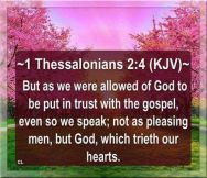 “But as we were allowed of God to be put in trust with the gospel, even so we speak; not as pleasing men, but God, which trieth our hearts.” 1 Thessalonians 2:4