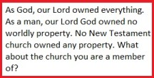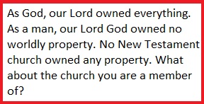 As God, our Lord owned everything. As a man, our Lord God owned no worldly property. No New Testament church owned any property. What about the church you are a member of?