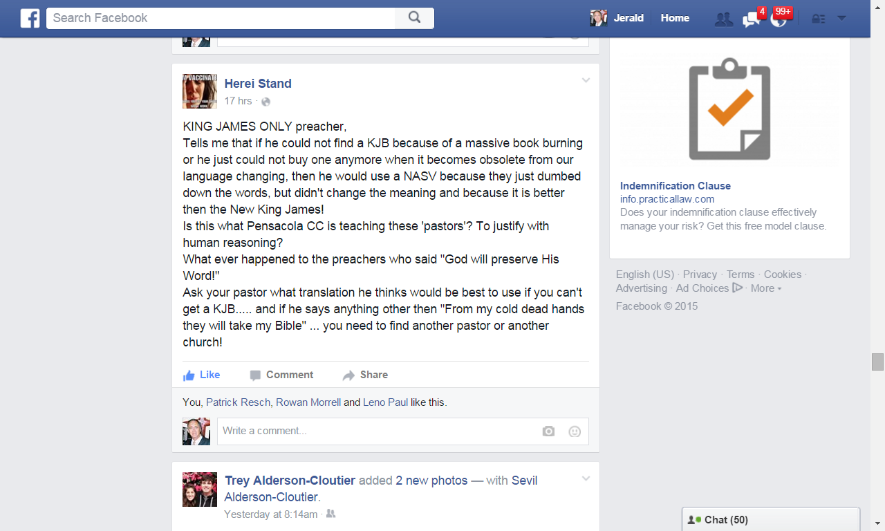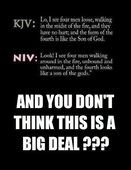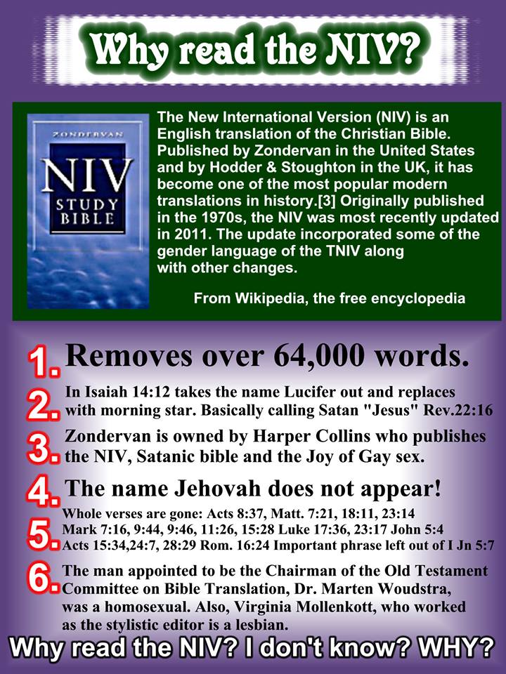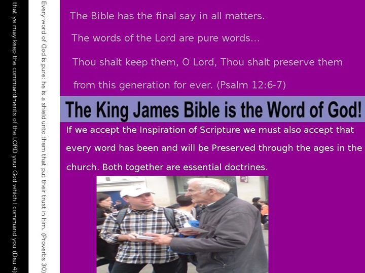 Since being saved, I have heard and read much teaching on the KJB versus other “translations” issue. Why was this important? Because the issue is so prominent to believers and to non-believers. Nothing is more important than the integrity of the word of God. I had some friends whom I believe were also born again, but who did not use the KJB. I even went to church with one or two of them just a couple of times. Even though I believe they were saved, I saw that they were not being well fed. I saw that their churches did not seem to have the power of the church I went to. Later, when I started intensely studying the Bible, I learned the reasons for these things, and the reasons for the attacks on the KJB. The downward spiral of heresy, apostasy, and immorality among “Christians” in America who use “interpetations” and not the KJB has confirmed and continues to confirm what the Lord taught me – that the KJB is the word of God.