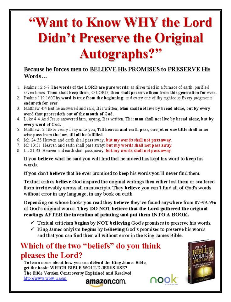Jeremiah 35-36 gives a great example of God’s destroyed words being rewritten. The originals were destroyed but the Lord rewrote them through Jeremiah, and the Lord even added more words. There are no originals for one to go to. That is no problem for God. When the king destroyed the words God gave Jeremiah, God gave those words to Jeremiah again. God has the ability, and has used his ability to preserve his words in the King James Bible.