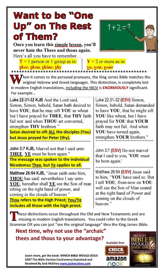 Here are a couple of other thoughts on the matter. Unlike all other versions, the language of the KJB has important nuances. For example, “thee” and “thou” are singular and “ye” and “you” are plural; this is very important in understanding some verses and passages of Scripture. Furthermore, the King James Bible is written on a fifth or sixth grade level. I once interviewed children in a church I was a member of; a church where all the parents homeschooled; a church that believed that the KJB was the Word of God in English. I asked a six year old girl if she read her Bible. She said, “Yes.” I asked her what her favoite book in the Bible was. She said, “Revelation.” I asked her if she would turn to Revelation and read some Scripture, which she did, and very well.