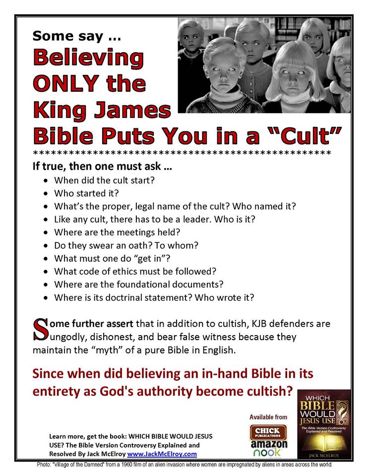 I believe the King James Bible is the Word of God in English. What is the definition of cult? People throw that word around without defining it.