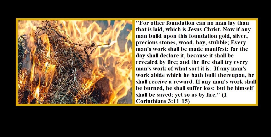 • 1 Corinthians 3:9-17: “For we are labourers together with God: ye are God’s husbandry, ye are God’s building.  According to the grace of God which is given unto me, as a wise masterbuilder, I have laid the foundation, and another buildeth thereon. But let every man take heed how he buildeth thereupon. For other foundation can no man lay than that is laid, which is Jesus Christ. Now if any man build upon this foundation gold, silver, precious stones, wood, hay, stubble; Every man’s work shall be made manifest: for the day shall declare it, because it shall be revealed by fire; and the fire shall try every man’s work of what sort it is.  If any man’s work abide which he hath built thereupon, he shall receive a reward. If any man’s work shall be burned, he shall suffer loss: but he himself shall be saved; yet so as by fire. Know ye not that ye are the temple of God, and that the Spirit of God dwelleth in you? If any man defile the temple of God, him shall God destroy; for the temple of God is holy, which temple ye are.” (Bold emphasis added).
