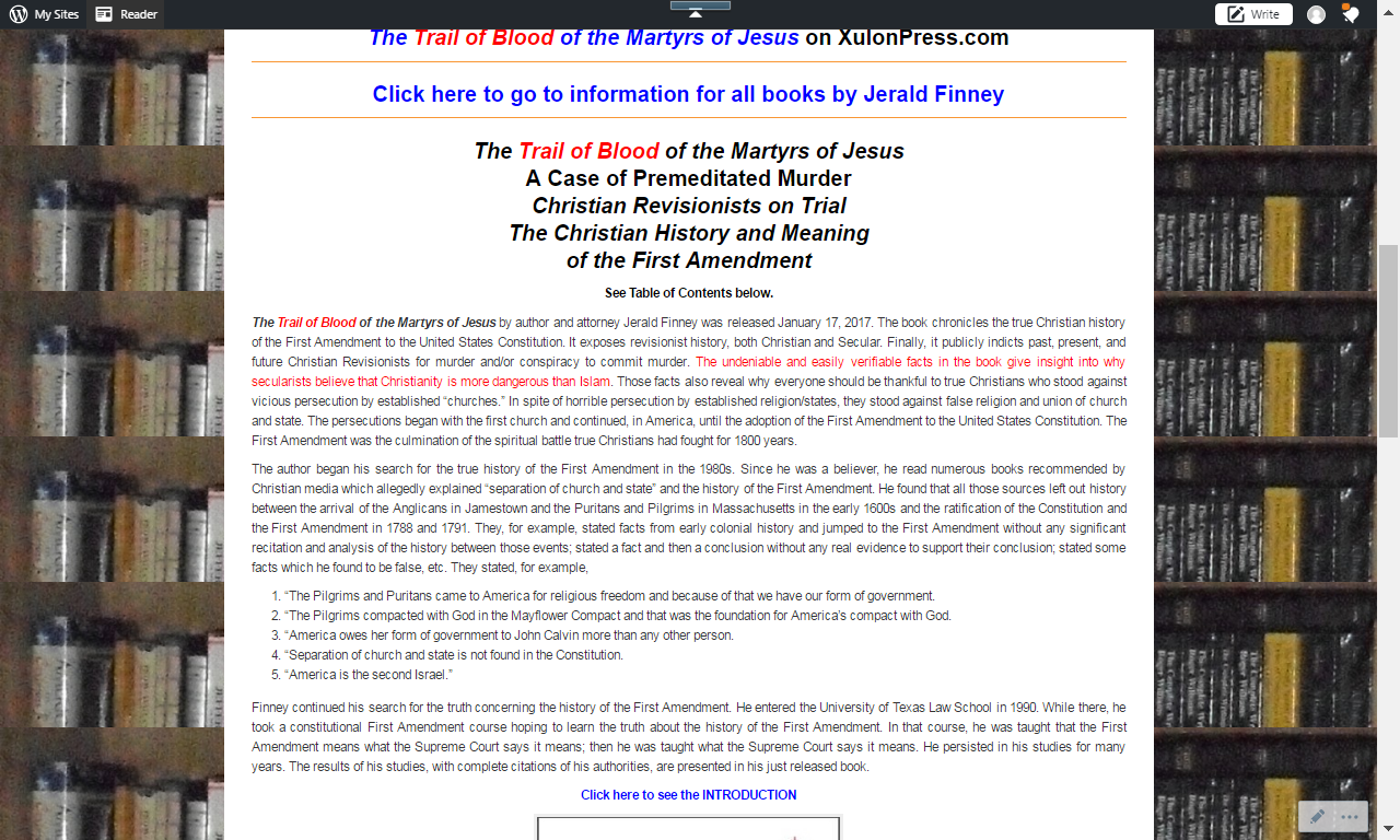 *Finney, Jerald, BBA, JD, BAB (Born-again believer), is a lawyer who has studied American colonial history for 12 years. He thoroughly documents his factual assertions so that the reader can check out what he is saying. Needless to say, mainstream “Christian” revisionists try to hide and ignore the truths he presents. See, The Trail of Blood of the Martyrs of Jesus/A Case of Premeditated Murder/Christian Revisionists on Trial/The History of the First Amendment, which covers not only the truth about colonial religious history but also the truth about “Christian” historical revisionism in America.