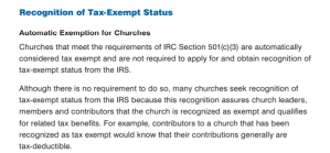 Notice that the above featured image, taken from IRS publications given below, says, “churches that meet the requirements of § 501(c)(3) are automatically considered tax exempt and are not required to apply for and obtain recognition of tax-exempt status from the IRS.” This is the correct position.